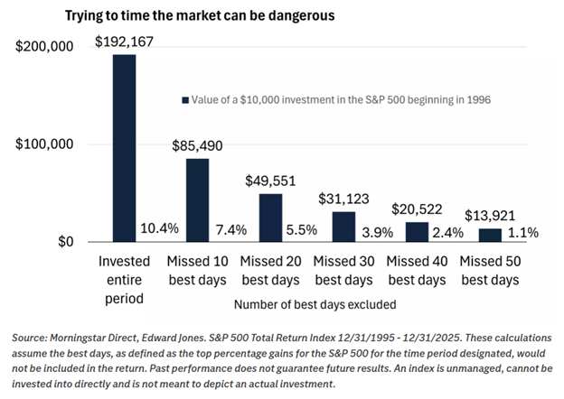 Many of the largest single‑day rallies happen during corrections, not bull markets. This happens more often than not. Wells Fargo Investment Institute mapped out the 30 best days and the 30 worst days for the S&P 500 over the past 30 years. It found that the largest percentage gains and the largest percentage losses often happened in quick succession. So going to the sidelines and waiting for an all-clear horn can be somewhat risky – missing out on these big days is very costly from a long-term growth perspective. Just take a look at the below chart.