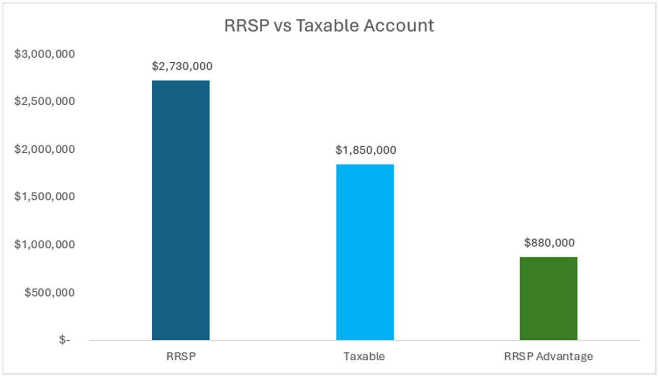 If you earn $150,000 and max your RRSP for 30 years at 7% returns, you save about $11,700 in tax each year and over $351,000 total. Choosing RRSPs over a taxable account becomes roughly a $1.23 million decision.