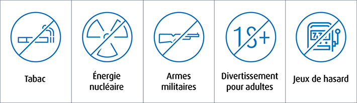 L’exclusion de certaines industries ou entreprises d’un portefeuille, généralement basé sur des critères éthiques ou moraux. Par exemple, de nombreux fonds communs de placement pratiquant l’IR excluent les fabricants de tabac et d’armes.