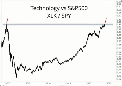 The question we are posed with now is, can markets break through the top line (in grey), or will that present too much resistance, resulting in tech markets falling again relative to the rest of the broad market and economy?