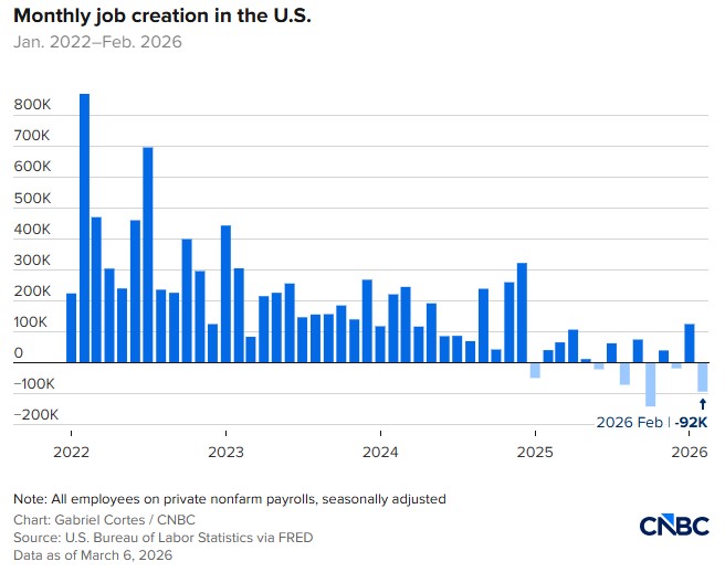 This is primarily an energy-price story. Higher energy prices do not just affect the cost of filling up a car. They lift inflation expectations, weigh on consumer confidence, and make the Federal Reserve’s job harder at exactly the moment that parts of the economy are already slowing. That is why an oil shock can raise stagflation risk so quickly: higher inflation at the same time as weaker growth is a difficult combination for both policymakers and markets.